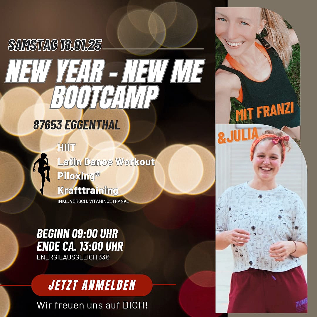 „NEW YEAR - NEW ME“ BOOTCAMP am Samstag, 18. Januar 2025 von 9 bis ca. 13 Uhr ➡️ HIIT ➡️ Latin Dance Workout ➡️ Piloxing ➡️ Krafttraining Das neue Jahr starten wir beim SV Eggenthal mit einem powervollen Bootcamp. Franzi (Group-Fitness-Trainerin, Fitnesstrainerin mit Fokus Krafttraining, Beckenbodentrainerin & Pädagogin) und Julia (Piloxing® Instructor, angehende Bewegungs- & Ernährungstherapeutin, Resilienztrainerin) werden ordentlich einheizen. Dieses Bootcamp schenkt dir die Möglichkeit an einem Tag in vier verschiedene Sportarten zu schnuppern und FIT ins neue Jahr zu starten. Weitere Infos und den Link zur Anmeldung findet du unter https://sv-eggenthal.de/gymnastik/aktuelles